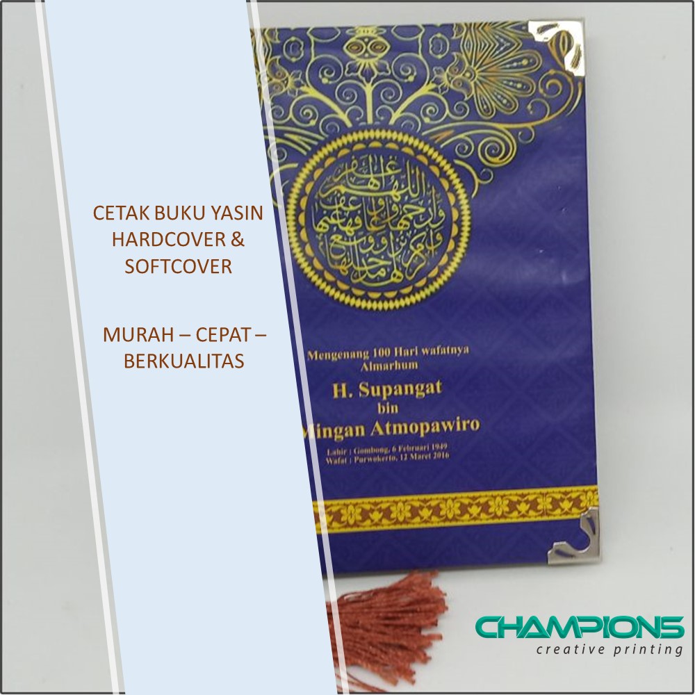 CHAMPIONS Creative Printing adalah Pusat Percetakan yang Melayani Jasa Cetak Blangko Buku Yasin dan Tahlil eksklusif dengan Harga Murah di Kabupaten Temanggung.Konsumen dimudahkan dengan Request / Permintaan Motif sesuai selera dengan Free konsultasi desain cover.